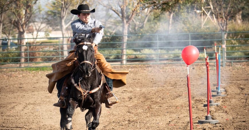 A beginner’s mounted shooting clinic in Acton. Cost is $150 and is limited to 12 riders.