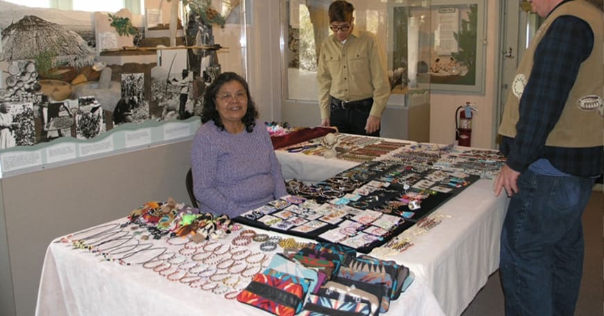 Visitors will have the opportunity to meet Cecelia Begay (Diné Navajo) on April 13 and 14. Cecelia was born and raised in Castle Butte, Arizona, on the Navajo Reservation, but has lived in the Antelope Valley for over 30 years. She is known for jewelry she creates using beads, juniper seeds, pine nuts, and shells.